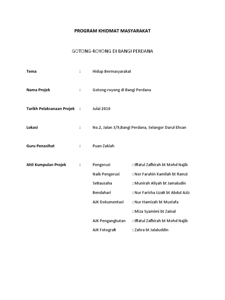 Contohnya, bilangan maksimum guru pelatih boleh dikurangkan kepada 40 orang. Borang pemarkahan induk projek khidmat masyarakat. Warisan kepelbagaian budaya malaysia nama projek : Contoh laporan pengabdian pada masyarakat. Projek khidmat masyarakat pendidikan sivik dan kewarganegaraan tingkatan 2.